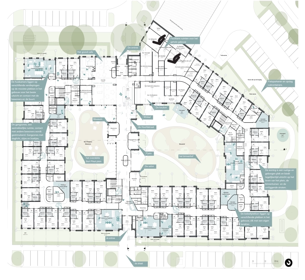 Het programma achter de gevel mag gezien worden, het is tenslotte een zorggebouw voor de buurt. Het restaurant, de huiskamers en beleefplekken vallen op vanwege de grote gevelopeningen. Ook de entrees zijn duidelijk herkenbaar, wellicht met een afwijkende vorm.