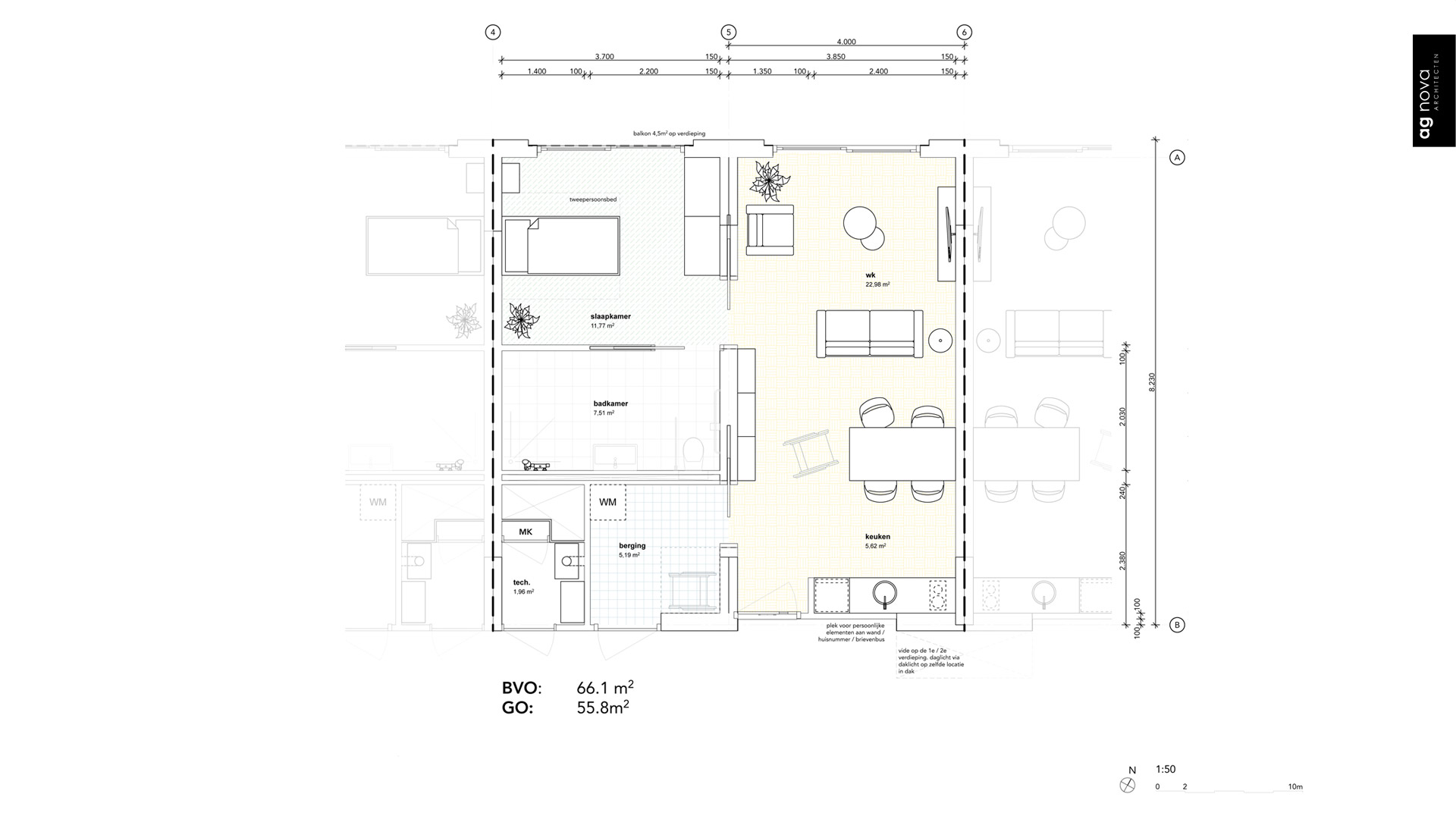 Het uitgangspunt in het ontwerp zijn bouwblokken van vier bij acht meter. Hiermee creëren we wooneenheden (2 x vier bij acht) of dagbestedingsruimtes (4 x vier bij acht). De eenheden worden in de fabriek geprefabriceerd en afgewerkt. Op de bouwplaats worden ze gestapeld tot drie lagen.